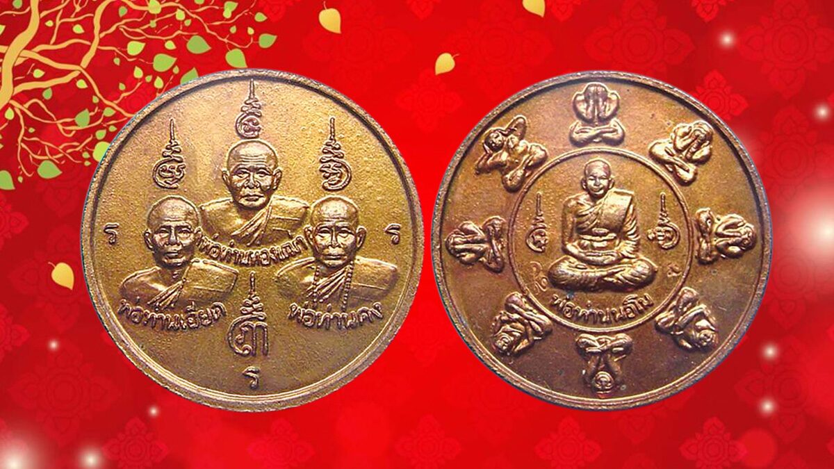 ลักษณะเป็นเหรียญกลม ไม่มีหูห่วง ด้านหน้าเป็นรูปเหมือนพ่อท่านนอโมเต็มองค์ นั่งกัมมัฏฐาน โดยได้นำรูปพระปิดทั้ง 8 ท่าทาง หรือที่เรียกกันว่าปิดทวาร รายล้อมรวมอยู่ด้วยกัน ด้านหลังเป็นรูปเหมือนของพระเกจิอาจารย์สายเขาอ้อ จัดสร้างเป็นหลายเนื้อด้วยกัน ปัจจุบันรุ่นนี้หาได้ค่อนข้างยากมาก