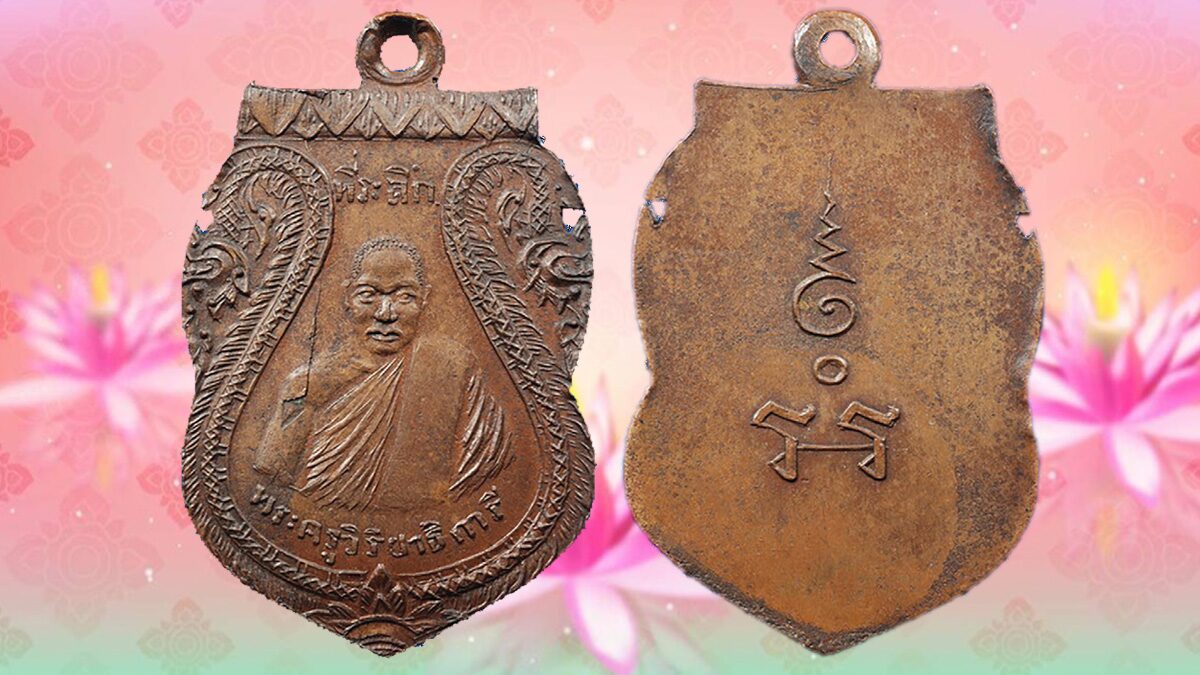 ด้านหน้าเหรียญแกะขอบเป็น ลวดลายกนก ตรงกลางเป็นรูปเหมือน ครึ่งองค์หันหน้าตรง ด้านบนรูปเหมือนเขียนคำว่า "ที่ระลึก" ด้านล่างรูปเหมือนเขียนคำว่า "พระครูวิริยาธิการี" ด้านหลังไม่มีขอบ ตรงกลางเป็นยันต์อุณาโลม ล่างลงมาเป็นอักขระขอม เป็นเหรียญยอดนิยมวงการพระเครื่อง