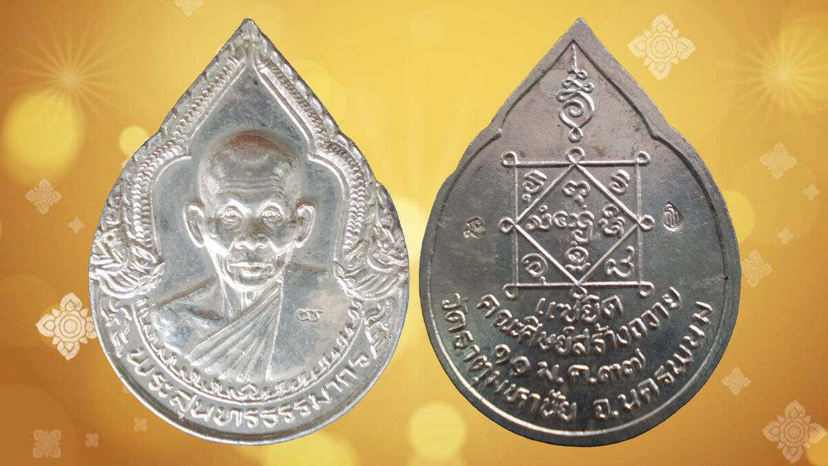 ลักษณะเป็นเหรียญรูปทรงหยดน้ำ ด้านหน้า ขอบสลักนูนซุ้มพญานาค 2 ข้าง กลางมีรูปเหมือนครึ่งองค์ลอยนูน ตรงจีวรตอกโค้ด "ธ.ช." ย่อมาจากพระธาตุมหาชัย ด้านล่างใกล้เส้นสันขอบนูน สลักคำว่า "พระสุนทรธรรมากร" สมณศักดิ์พระครูสัญญาบัตรชั้นเอก